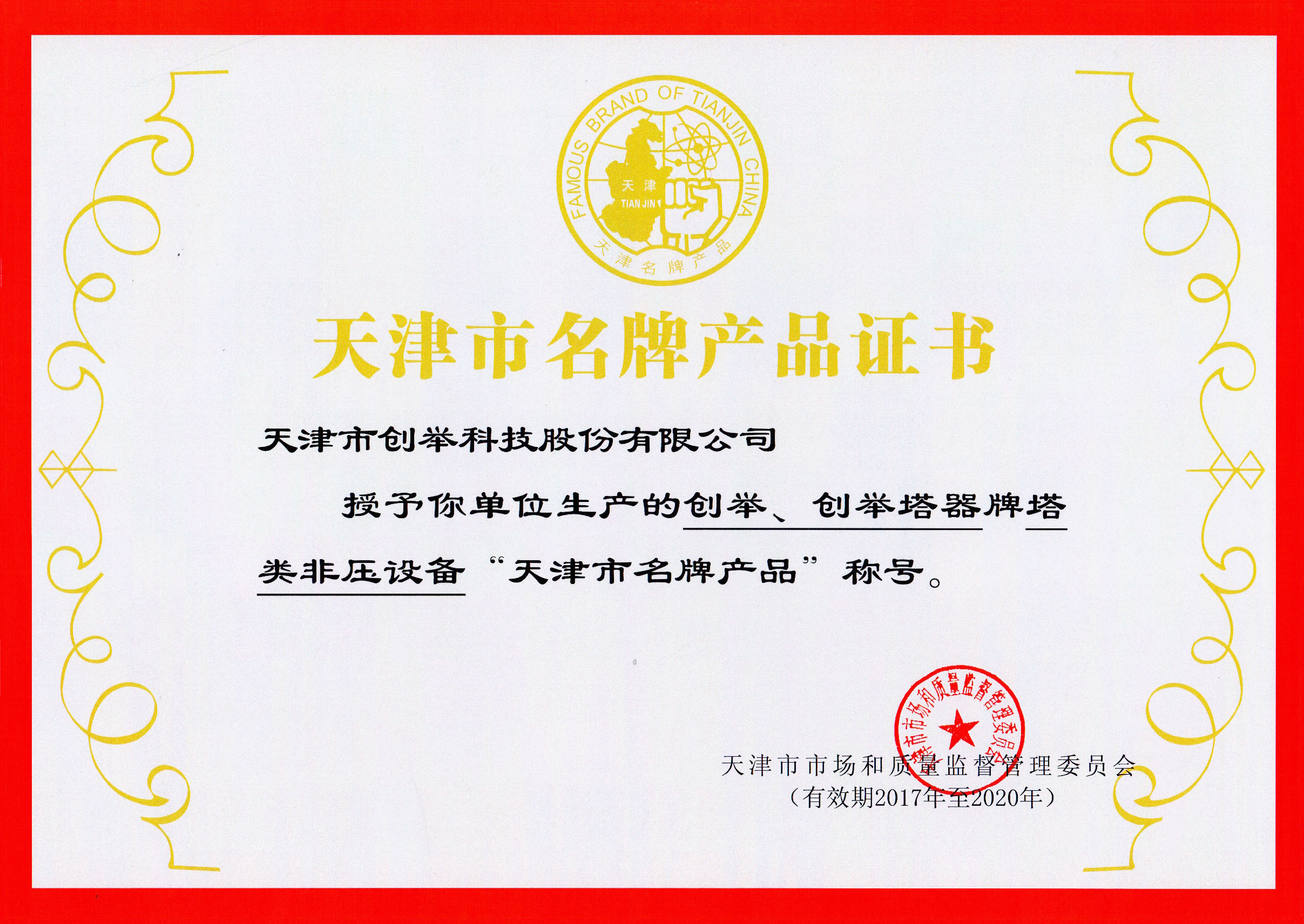 2014年 “創(chuàng )舉塔器”獲得天津市名牌產(chǎn)品稱(chēng)號。