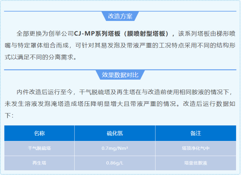 2019年9月,陜西某公司酸性水汽提裝置中的脫硫化氫塔、硫磺回收裝置中的干氣脫硫塔及再生塔三臺塔全部一次性開(kāi)車(chē)成功。該項目采用天津市創(chuàng )舉科技股份有限公司(以下簡(jiǎn)稱(chēng)“創(chuàng )舉公司”)新型CJ系列高效噴射態(tài)塔盤(pán)技術(shù)。