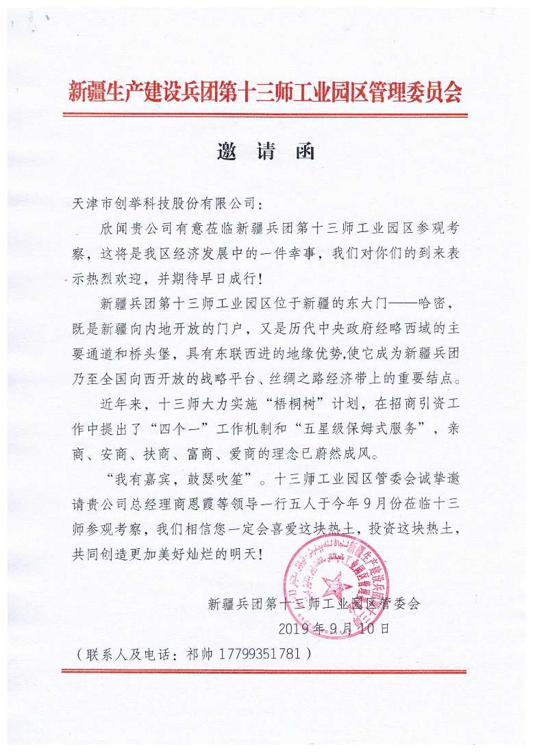 2019年月23日,天津市創(chuàng )舉科技股份有限公司(以下簡(jiǎn)稱(chēng)“創(chuàng )舉公司”)受邀赴新疆生產(chǎn)建設兵團第十三師工業(yè)園區交流考察。