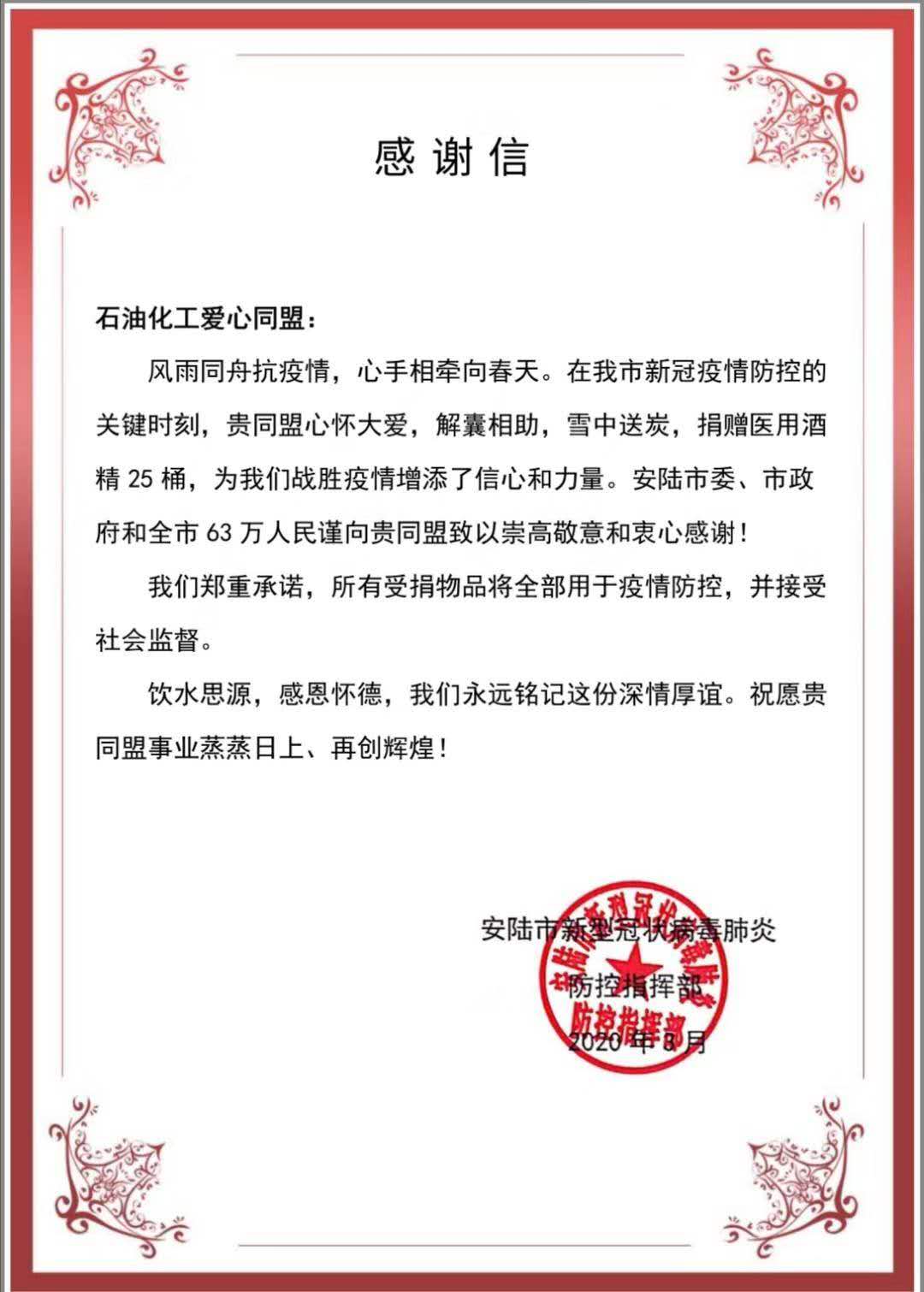 “風(fēng)雨同舟抗疫情,心手相牽向春天。在我市新冠疫情防控的關(guān)鍵時(shí)刻,貴同盟心懷大愛(ài),解囊相助,雪中送炭,捐贈醫用酒精25桶,為我們戰勝疫情增添了信心和力量。安陸市委、市政府和全市63萬(wàn)人民謹向貴同盟致以崇高的敬意和衷心感謝!”2020年3月,湖北省安陸市委、市政府向石油化工愛(ài)心同盟發(fā)來(lái)感謝信,對同盟在抗擊疫情過(guò)程中,對安陸市的酒精捐助表示敬意和感謝。