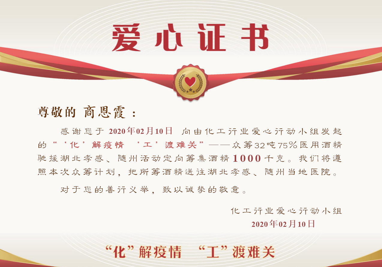 2月9日開(kāi)始,歷經(jīng)72小時(shí)的石油化工行業(yè)同盟75愛(ài)心行動(dòng),各企業(yè)代表、行業(yè)機構(平臺)、科研院校等1064位愛(ài)心人士(參與次數1100人次)共同籌集完成了30噸(1車(chē))75%醫用酒精的目標。身為化工行業(yè)的一員,天津市創(chuàng )舉科技股份有限公司商恩霞總經(jīng)理代表公司,捐贈酒精1000千克。
