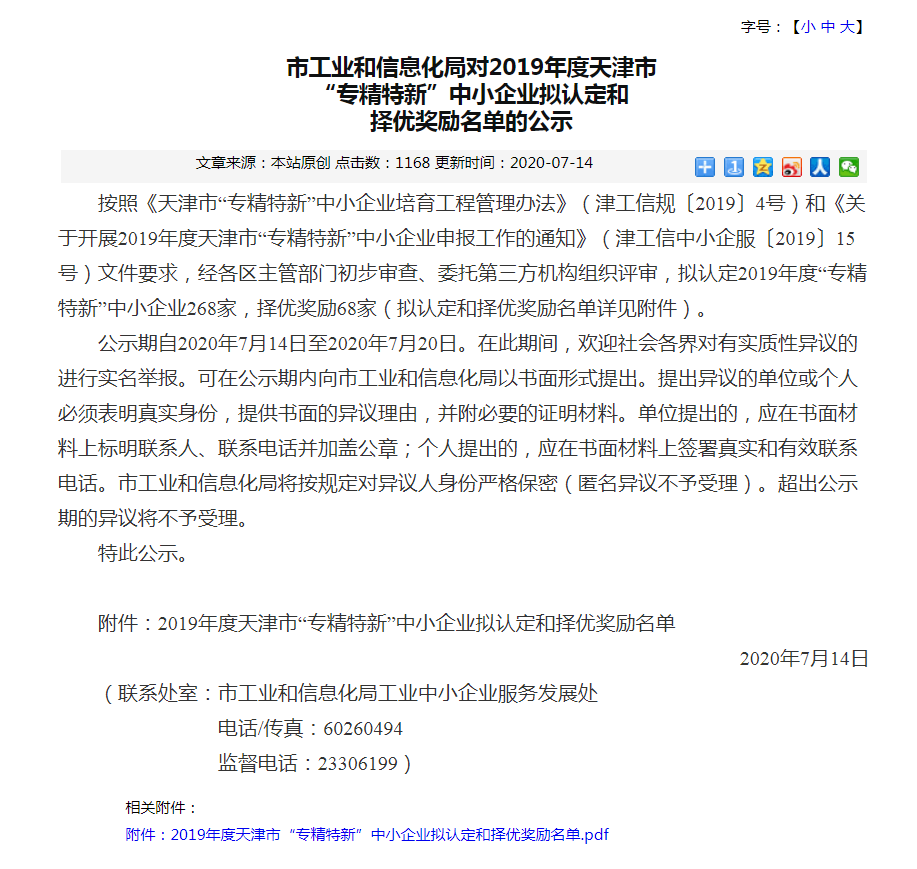 2020年7月,天津市工業(yè)和信息化局發(fā)布了2019年度天津市“專(zhuān)精特新”中小企業(yè)申報情況公示。天津市創(chuàng )舉科技股份有限公司(以下簡(jiǎn)稱(chēng)“創(chuàng )舉科技”)憑借其在專(zhuān)業(yè)化、精細化、特色化和新穎化方面的獨特優(yōu)勢,經(jīng)過(guò)第三方機構的審核推薦、專(zhuān)家組評審,成功通過(guò)“專(zhuān)精特新”企業(yè)認證。