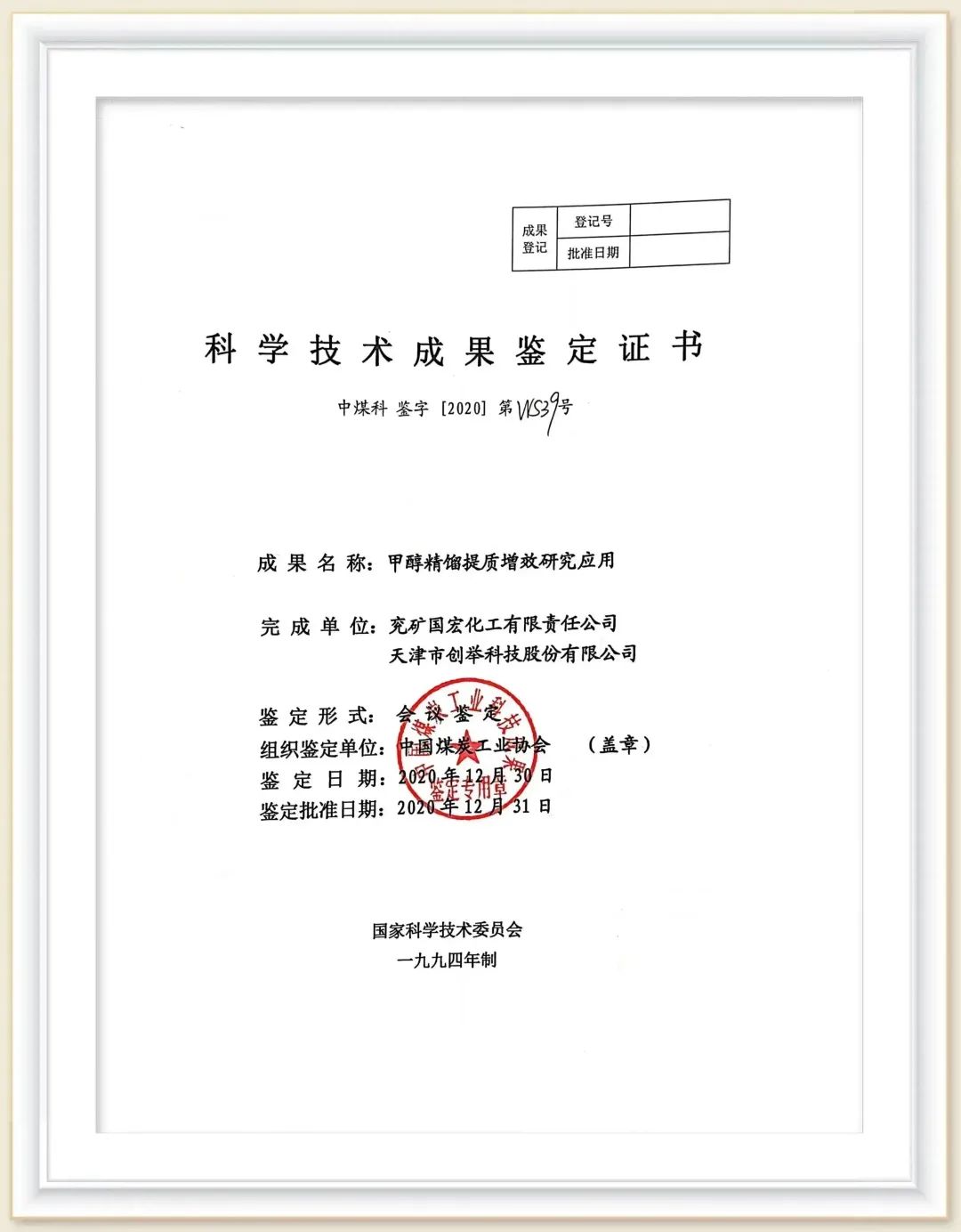 2020年,由兗礦國宏公司及創(chuàng )舉科技共同申報的“甲醇精餾提質(zhì)增效研究應用”順利通過(guò)中國煤炭工業(yè)協(xié)會(huì )科學(xué)技術(shù)成果鑒定,并鑒定該項技術(shù)成果達到“國際先進(jìn)”水平。