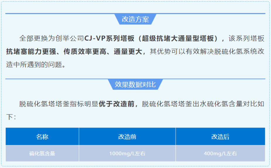 全部工程改造完工后,各項技術(shù)指標均滿(mǎn)足生產(chǎn)要求,達到了改造的目的和預期,緩解業(yè)主單位的環(huán)保壓力的同時(shí)延長(cháng)了設備檢修周期。創(chuàng )舉公司新型CJ系列高效噴射態(tài)塔盤(pán)技術(shù)在脫硫化氫塔、干氣脫硫塔及再生塔的應用效果,得到了榆林煉化領(lǐng)導的高度認可。該項目的順利開(kāi)車(chē)是創(chuàng )舉公司在行業(yè)內的又一次成功改造案例。
