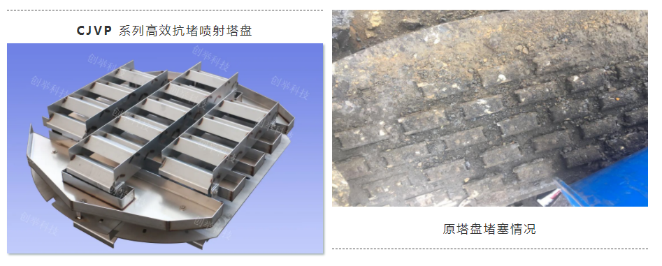 為解決原塔盤(pán)堵塞嚴重的問(wèn)題,該項目采用我公司最新研發(fā)的CJVP 系列高效抗堵噴射塔盤(pán),無(wú)易堵部件,在保證塔板效率的同時(shí)兼顧抗堵的性能。