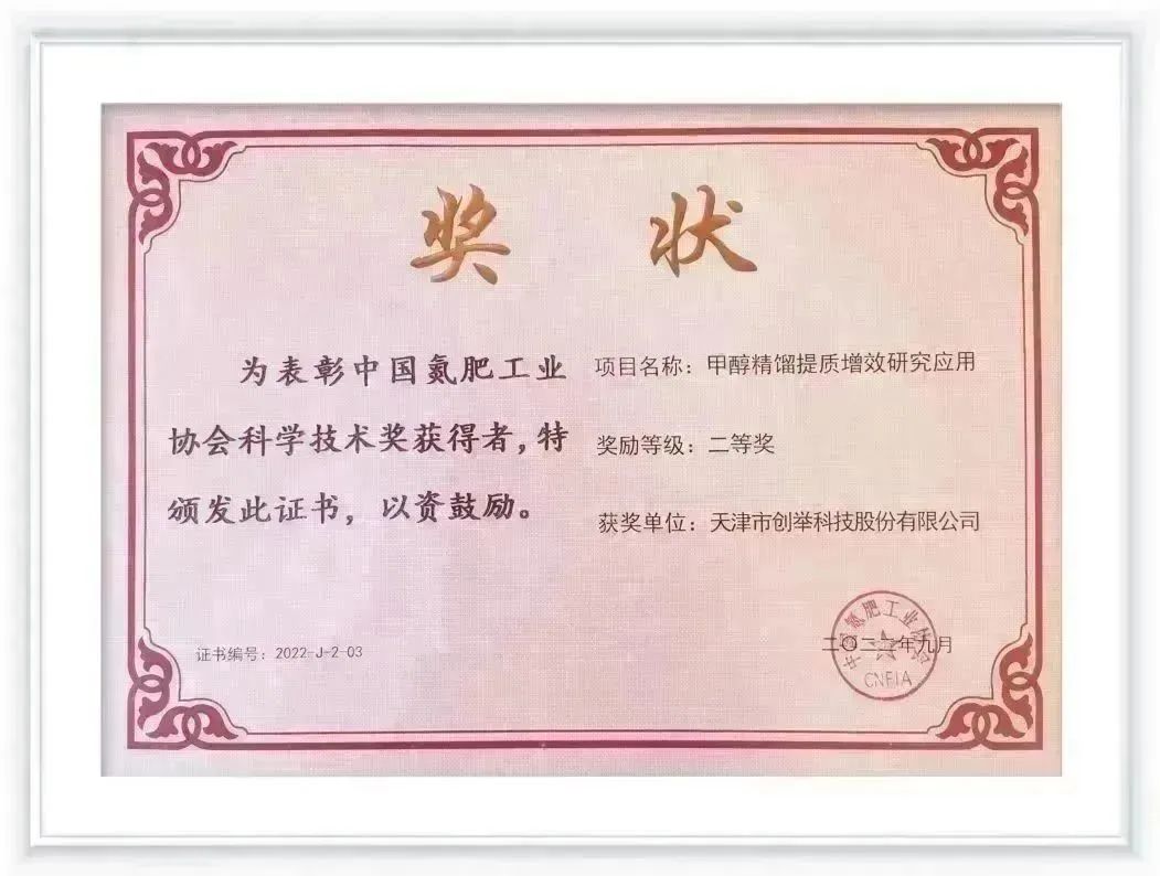 會(huì )上,中國氮肥工業(yè)協(xié)會(huì )對科技創(chuàng )新方面做出突出貢獻的企業(yè)進(jìn)行了表彰。天津市創(chuàng )舉科技股份有限公司(以下簡(jiǎn)稱(chēng)“創(chuàng )舉科技”)申報的“甲醇精餾提質(zhì)增效研究應用”項目,榮獲中國氮肥工業(yè)協(xié)會(huì )科學(xué)技術(shù)獎二等獎。