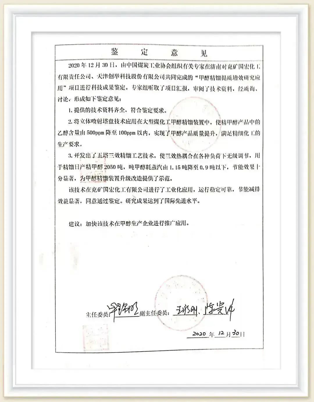 2020年,由兗礦國宏公司及創(chuàng )舉科技共同申報的“甲醇精餾提質(zhì)增效研究應用”順利通過(guò)中國煤炭工業(yè)協(xié)會(huì )科學(xué)技術(shù)成果鑒定,并鑒定該項技術(shù)成果達到“國際先進(jìn)”水平。