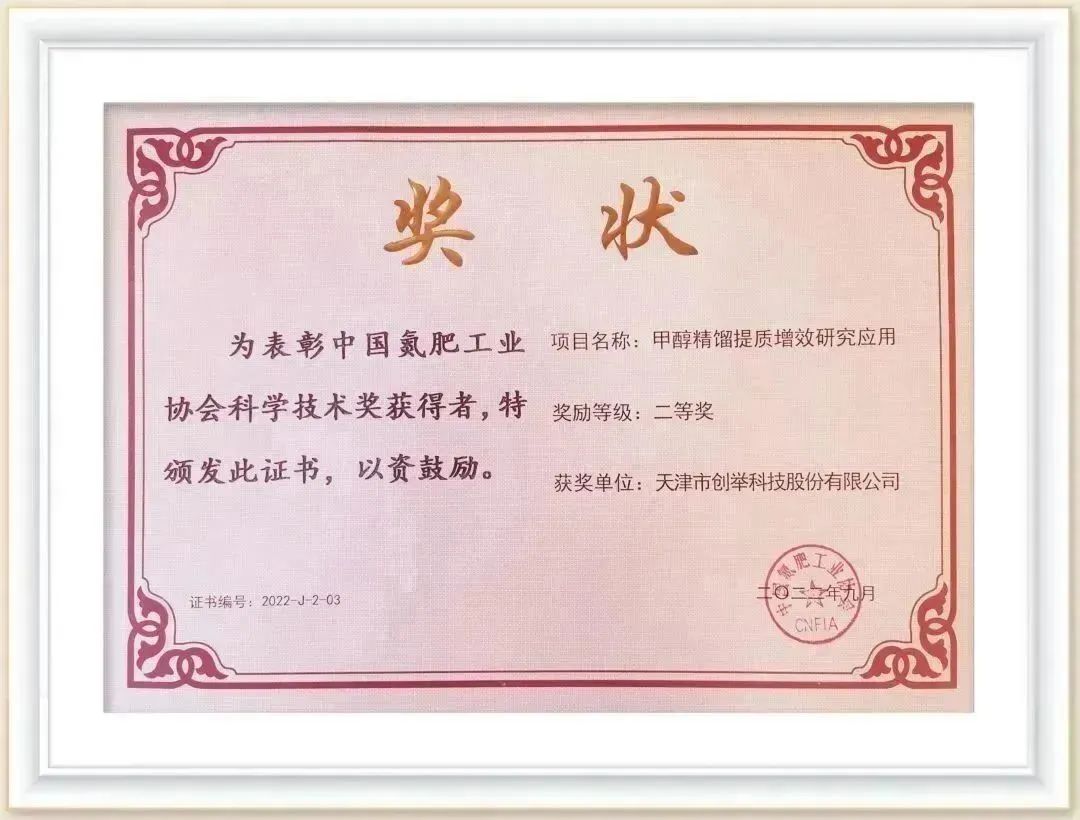 2022年,創(chuàng )舉科技申報的“甲醇精餾提質(zhì)增效研究應用”項目,榮獲中國氮肥工業(yè)協(xié)會(huì )科學(xué)技術(shù)獎二等獎。