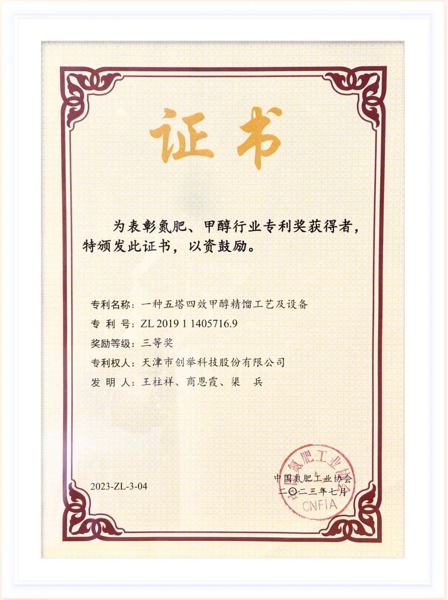 創(chuàng )舉科技自主研發(fā)的“一種甲醇五塔四效精餾工藝及設備”發(fā)明專(zhuān)利榮獲“2022年度氮肥、甲醇行業(yè)專(zhuān)利獎三等獎”。該專(zhuān)利是一種節能型甲醇精餾工藝,在運行過(guò)程中減少了新鮮蒸汽和循環(huán)冷卻水的消耗量,同時(shí)增強塔釜液循環(huán)強度,從而達到高效節能的效果。