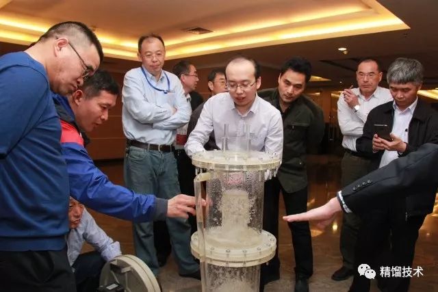 嘉賓們還觀(guān)摩了創(chuàng )舉帶來(lái)的冷模實(shí)驗塔,對逆流系列塔板的技術(shù)有了直觀(guān)的認識。