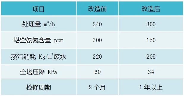 2019年更換為我公司CJVP塔板后,裝置運行穩定,檢修周期延長(cháng),處理量擴大25%,蒸汽消耗節省5%以上,改造前后數據對比如下: