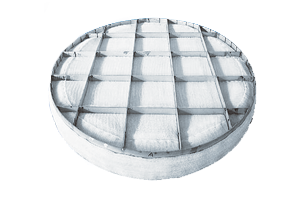 H型除沫器具有除沫效率高、抗堵塞的特點(diǎn)。通過(guò)H型和V型折流板的巧妙組合,使得氣液在并流過(guò)程中兩次改變流動(dòng)方向,并且發(fā)生液滴的并聚,并聚下降的液滴落到導流槽后,通過(guò)自身重力流到塔盤(pán)上。這種組合既克服了除沫效率不高的缺點(diǎn),又對含有固體懸浮顆粒的易堵物系有較好的抗堵性能。除沫段的壓力降一般在50-200Pa之間,對阻力降比較苛刻的塔是十分適合的。另外該除沫器設有上下雙管沖洗裝置,可定期對除沫器上積存的固體懸浮物進(jìn)行沖洗,避免堵塞,操作十分方便。